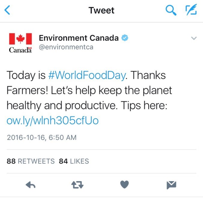 Environment Canada recently tweeted a link in honour of World Food Day. It seemed like a nice thing to do, they even said “Thanks Farmers” which seemed sweet. Sweet enough that I was shocked and dismayed when I followed the link to read the tips suggested on how to keep our planet healthy and productive. Two of their suggestions specifically were a slap in the face to the many farmers who not only work extremely hard to raise food for Canadians to eat, but also fund Environment Canada through their taxes.
